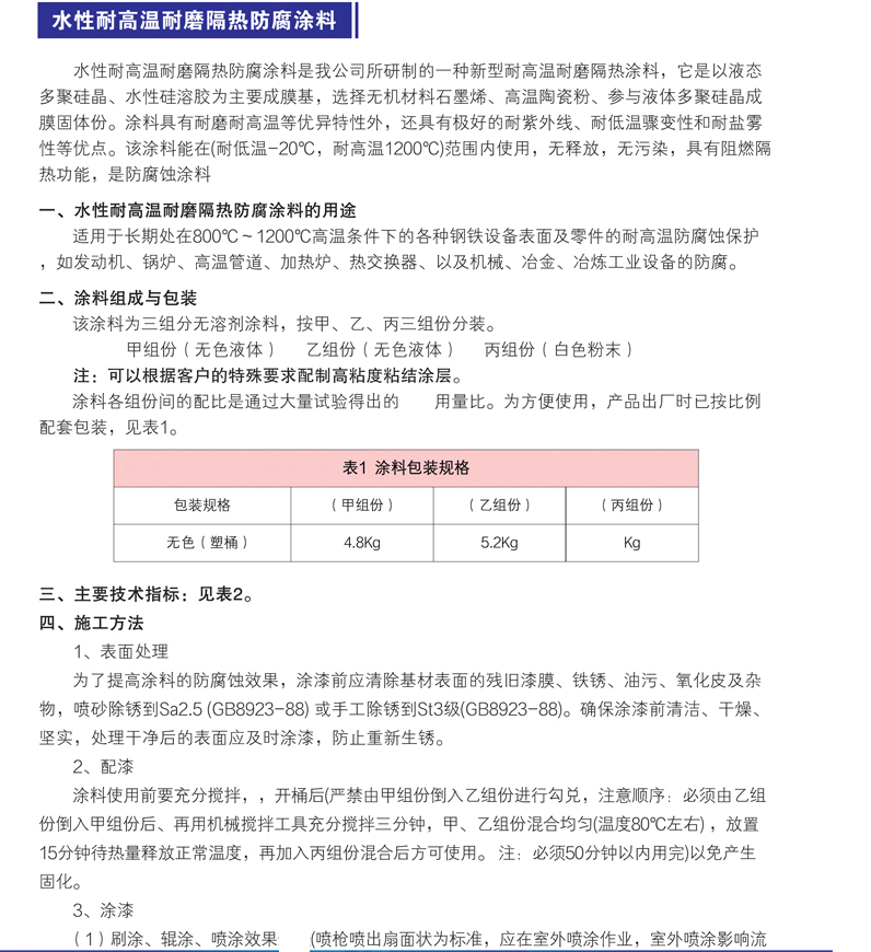 適用于長期處于800℃~1200℃高溫條件下的各種鋼鐵設備表面及零件的耐高溫防腐蝕保護,如發(fā)動機、鍋爐、高溫熱氣管道、加熱爐、熱交換器、以及機械、冶金、冶煉工業(yè)設備的防腐。