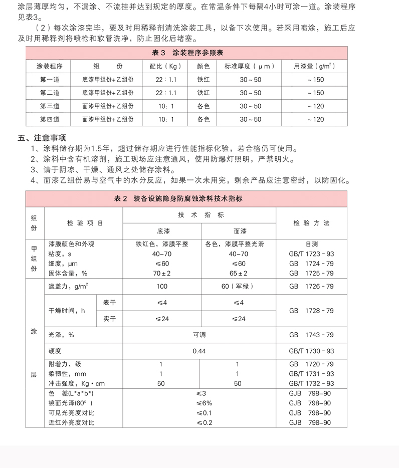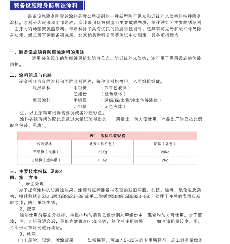適用于軍用裝備設(shè)施的防腐蝕保護(hù)和防可見光、防近紅外光偵察,還可用于民用設(shè)施的偽裝防護(hù)。